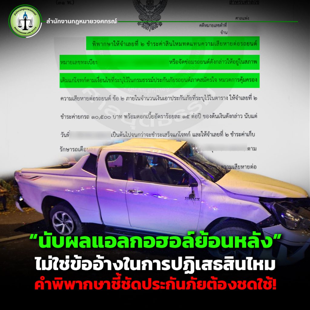 หากผลตรวจแอลกอฮอล์ในร่างกายจากหน่วยงานทางการระบุว่าอยู่ในเกณฑ์ที่กฎหมายกำหนด และไม่มีการตั้งข้อหาจากพนักงานสอบสวน บริษัทประกันภัยไม่สามารถอ้าง “การคำนวณย้อนหลัง” เป็นเหตุปฏิเสธความรับผิดได้