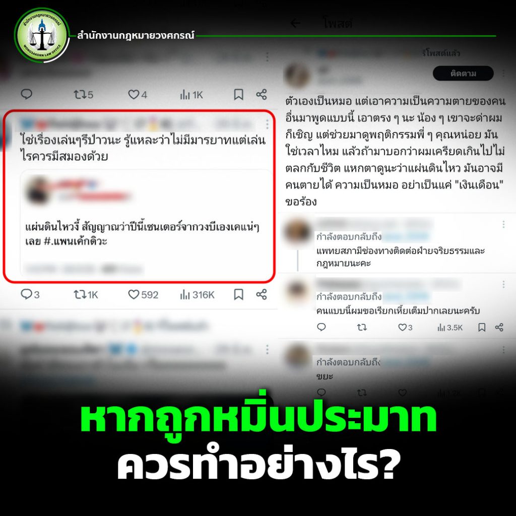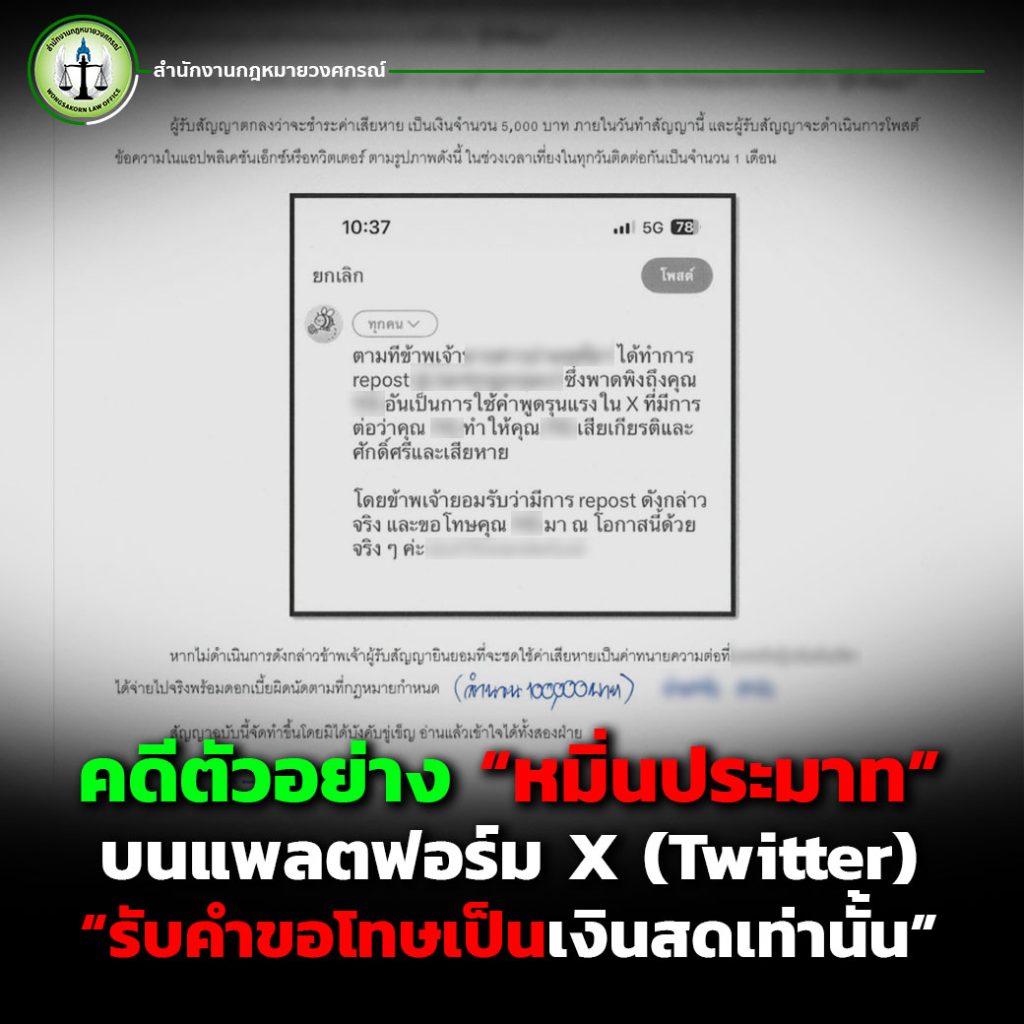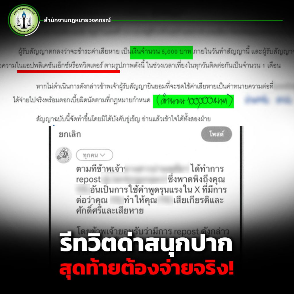 จากเคสจริงที่ สำนักงานกฎหมายวงศกรณ์ ได้รับเรื่องดำเนินคดีให้กับผู้เสียหายคนหนึ่งที่ถูกรีโพสต์ข้อความด่าทออย่างหยาบคายบนแพลตฟอร์ม X (หรือที่รู้จักกันในชื่อเดิมว่า Twitter) ซึ่งทำให้ผู้เสียหายรู้สึกว่าถูกลบหลู่ชื่อเสียง เสียเกียรติ และถูกพาดพิงในทางเสื่อมเสีย