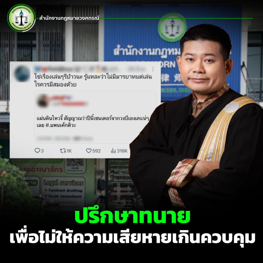 หากคุณต้องการคำปรึกษาทางกฎหมายเกี่ยวกับคดีหมิ่นประมาท ติดต่อ สำนักงานกฎหมายวงศกรณ์ ทันที เพื่อไม่ให้ความเสียหายลุกลามจนเกินควบคุม