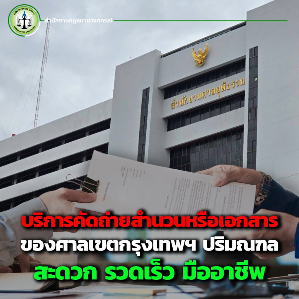 สำนักงานกฎหมายวงศกรณ์ยินดีให้บริการคัดถ่ายสำนวนของศาลในเขตกรุงเทพฯ และปริมณฑลที่ครอบคลุมและครบวงจร สำหรับผู้ที่ไม่สะดวกเดินทางมาด้วยตนเองในเขตกรุงเทพฯ และปริมณฑล ทีมงานมืออาชีพของเราพร้อมให้บริการคัดถ่ายเอกสารทุกประเภทที่เกี่ยวข้องกับคดีความในศาล ไม่ว่าจะเป็นคำฟ้อง คำให้การจำเลย คำร้อง คำแถลง และเอกสารอื่น ๆ ที่เกี่ยวข้อง ด้วยความชำนาญและความรวดเร็ว เพื่อให้คุณได้รับความสะดวกสบายสูงสุด