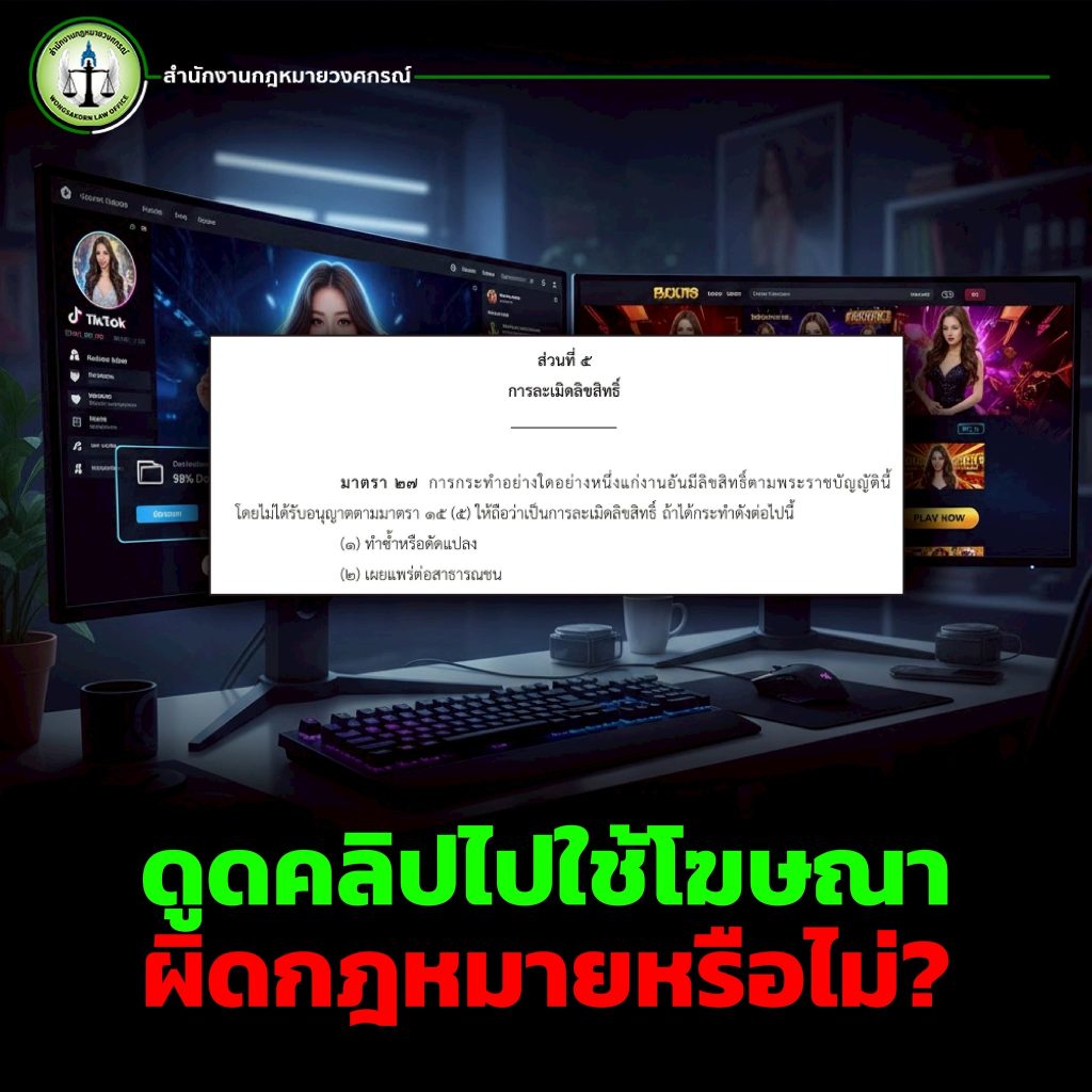 ในยุคที่การตลาดออนไลน์เติบโตอย่างรวดเร็ว การนำคลิปวิดีโอไปใช้ประกอบการโฆษณาเป็นเรื่องที่พบเห็นได้ทั่วไป อย่างไรก็ตาม การนำคลิปของผู้อื่นไปใช้โดยไม่ได้รับอนุญาต โดยเฉพาะการ “ดูดคลิป” ไปใช้เพื่อโปรโมตสินค้า บริการ หรือเว็บไซต์ต่าง ๆ เช่น เว็บหวย หรือเว็บพนัน ย่อมก่อให้เกิดคำถามสำคัญว่า การกระทำดังกล่าวเข้าข่ายผิดกฎหมายหรือไม่ และเจ้าของคลิปสามารถใช้สิทธิทางกฎหมายใดเพื่อคุ้มครองตนเองได้บ้าง การทำความเข้าใจประเด็นนี้อย่างถูกต้องจึงเป็นสิ่งจำเป็นอย่างยิ่งก่อนพิจารณาดำเนินการใด ๆ ต่อไป
