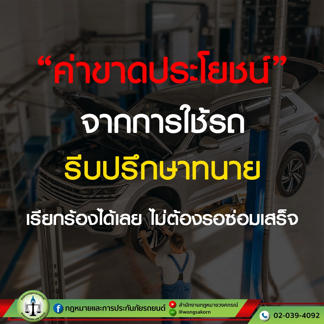 อยากฝากถึงผู้เสียหายทุกท่านที่ขณะนี้กำลังประสบปัญหาเกี่ยวกับการรอซ่อมรถ รออะไหล่นาน ฯลฯ สาระพัดข้ออ้างต่าง ๆ ที่ทำให้รถที่ต้องใช้ทำมาหาในชีวิตประจำวันของคุณยังซ่อมไม่เสร็จเสียที หรือใช้เวลานานกว่าที่ควรจะเป็น อย่าปล่อยให้เวลาไหลไปเรื่อย ๆ เหมือนสายน้ำ สามารถเรียกค่าขาดประโยชน์จากการใช้รถได้ และควรหาทนายไว้ปรึกษาดีที่สุด เพื่อไม่หลงเชื่อบริษัทประกันภัย และรักษาผลประโยชน์ให้ตัวคุณเอง ปรึกษาทนายดำเนินการเรียกค่าขาดประโยชน์ที่ สำนักงานกฎหมายวงศกรณ์