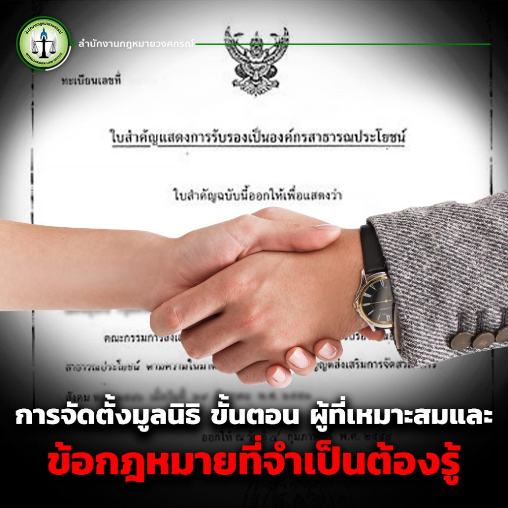 การจัดตั้งมูลนิธิเป็นกระบวนการที่มีข้อกำหนดทางกฎหมายที่ชัดเจนและซับซ้อน ผู้ที่ต้องการก่อตั้งมูลนิธิเพื่อดำเนินงานด้านสาธารณประโยชน์หรือช่วยเหลือสังคมจึงควรศึกษาขั้นตอนต่าง ๆ ให้ดี รวมถึงพิจารณาว่าการมีทนายความช่วยดูแลเรื่องการก่อตั้งจะช่วยให้กระบวนการเป็นไปอย่างถูกต้องและราบรื่นมากขึ้น