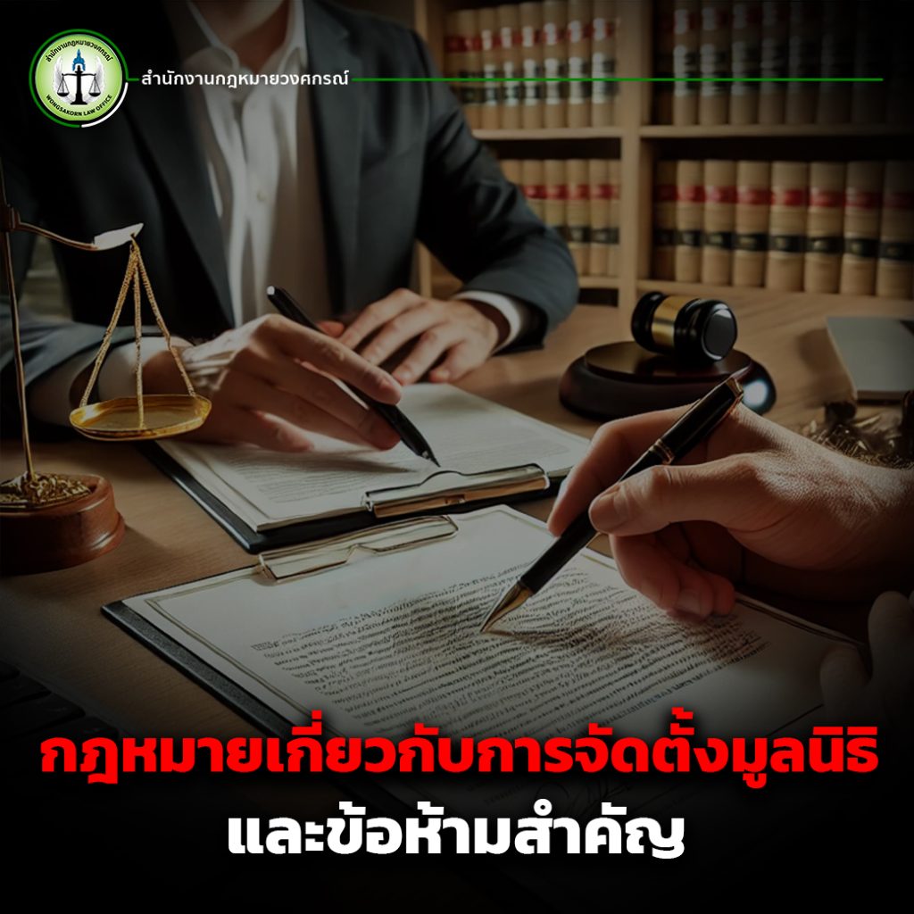กฎหมายเกี่ยวกับมูลนิธิกำหนดให้มูลนิธิต้องดำเนินการตามวัตถุประสงค์ที่ไม่แสวงหากำไร และมีระบบบริหารจัดการที่โปร่งใส ข้อห้ามสำคัญรวมถึงการใช้ชื่อมูลนิธิ การใช้ทรัพย์สิน วัตถุประสงค์ และการรายงานทางการเงิน การมีทนายความดูแลตั้งแต่ต้นจะช่วยให้กระบวนการจัดตั้งและบริหารงานของมูลนิธิเป็นไปอย่างถูกต้องตามกฎหมาย