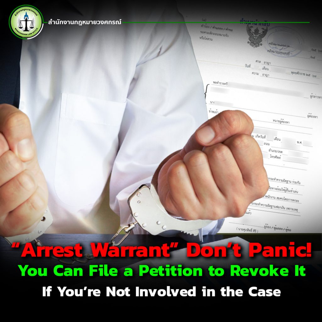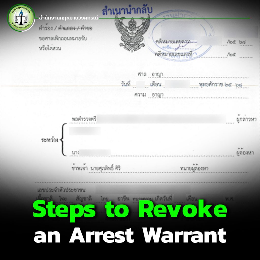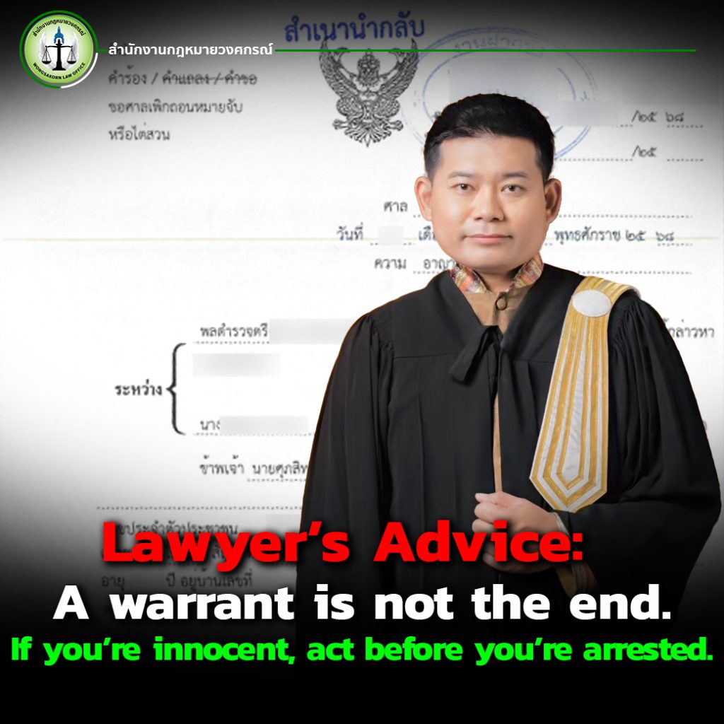 Wongsakorn Law Office offers professional services to help investigate and file petitions to revoke arrest warrants. If you suspect or know there’s a warrant against you, don’t wait. Contact us immediately. We’ll help you handle it safely and legally.