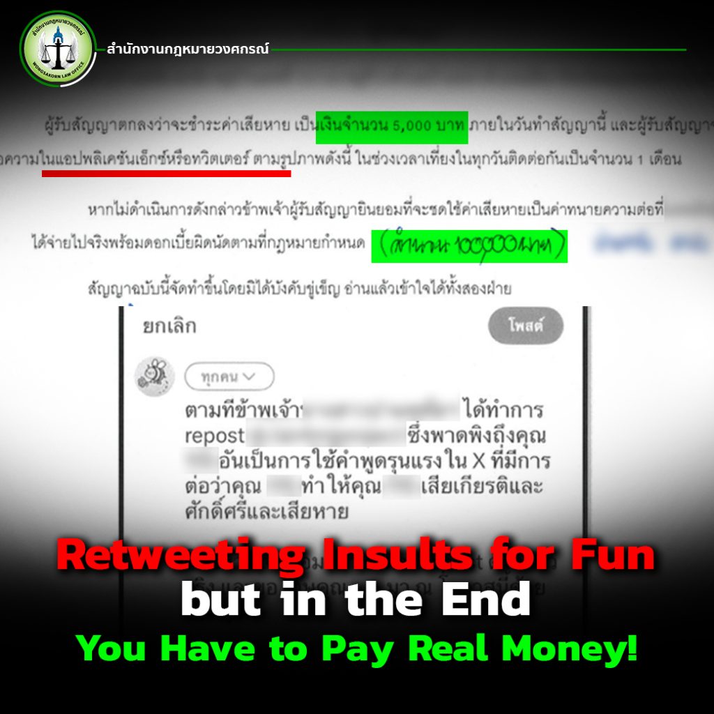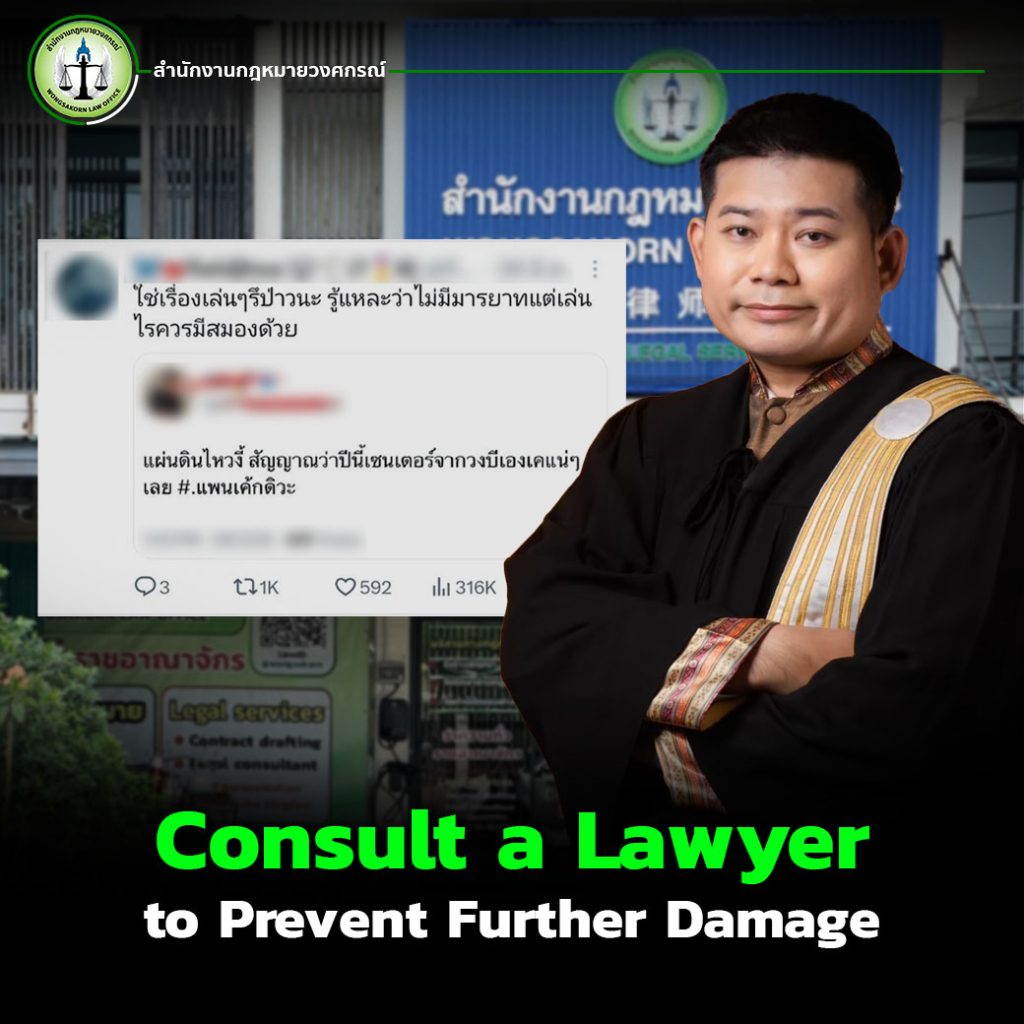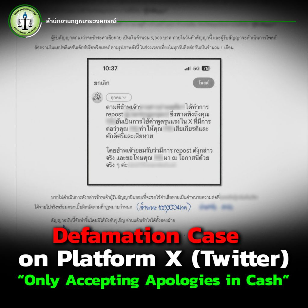 This is based on a real case handled by Wongsakorn Law Office, which represented a victim who had been defamed through rude comments reposted on Platform X (formerly known as Twitter). The victim felt that their reputation was tarnished, their honor was damaged, and they were publicly slandered.