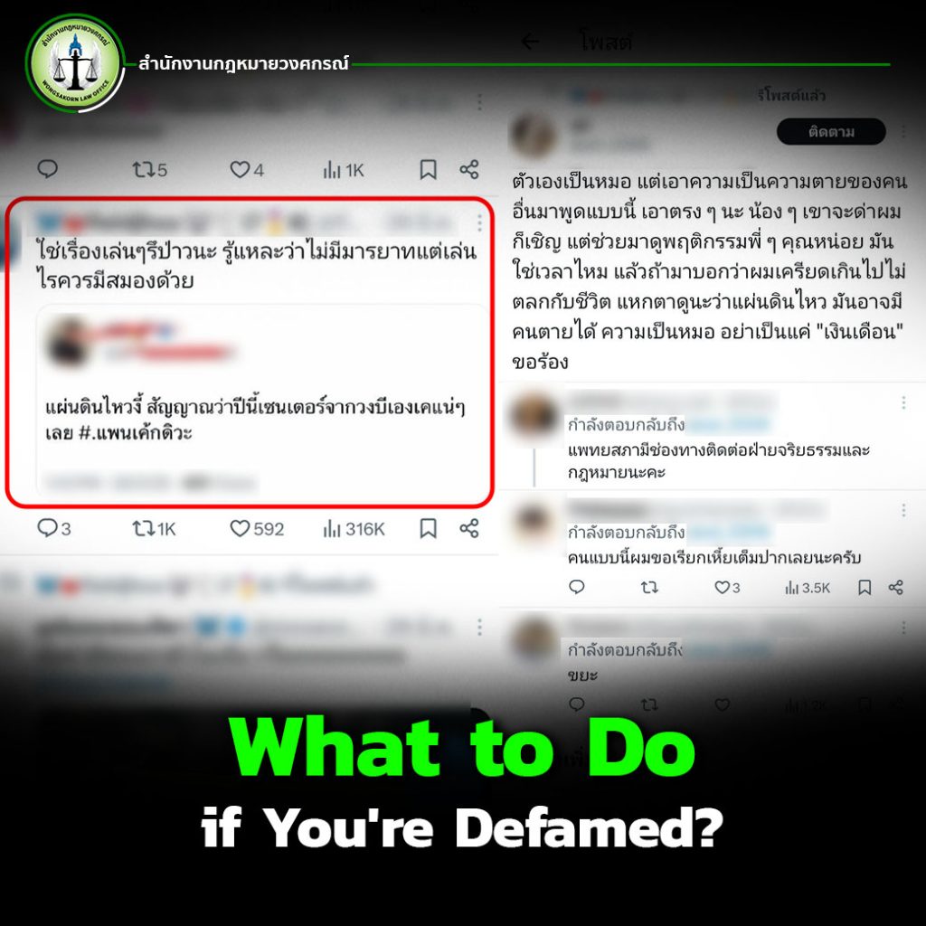 If you need legal advice regarding a defamation case, contact Wongsakorn Law Office immediately to prevent further damage from escalating beyond control.