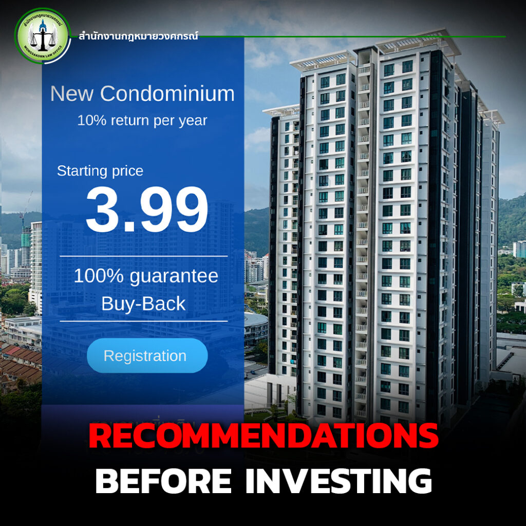 Investing in condominiums with buy-back guarantees can be an attractive option for those seeking reduced risk and assured returns. However, investors should thoroughly review contracts and assess potential risks before making a decision.If you need professional legal advice regarding real estate investments or buy-back agreements, Wongsakorn Law Firm is here to protect your rights and help you invest with confidence. Contact us today for a consultation before making your investment decision!