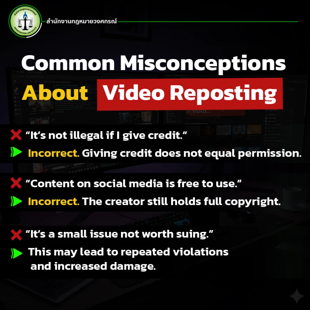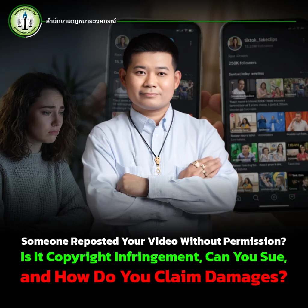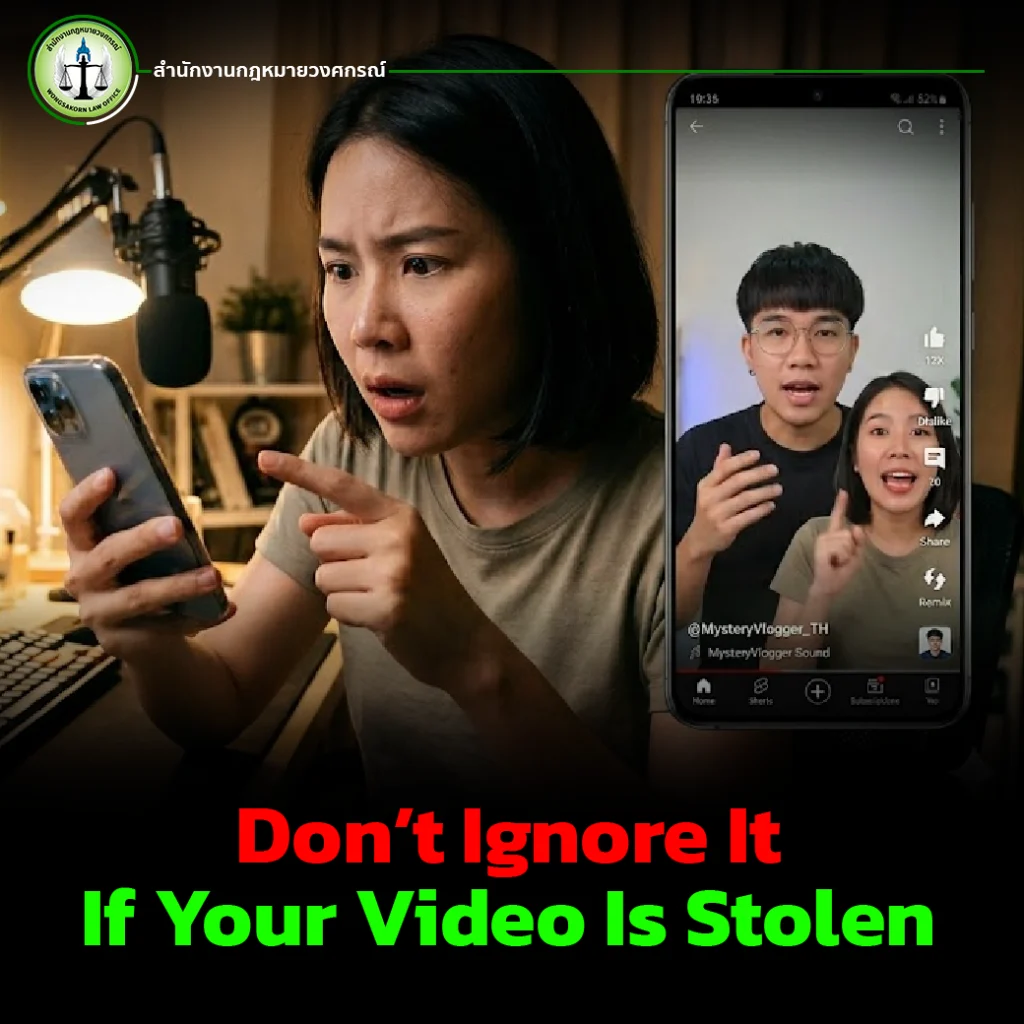 Under Thai copyright law, a video is automatically protected as a copyrighted work from the moment it is created. Therefore, any unauthorized use typically constitutes copyright infringement, unless it falls under specific legal exceptions (which usually do not apply when the content is reused for personal or commercial benefit).