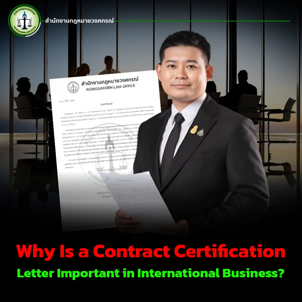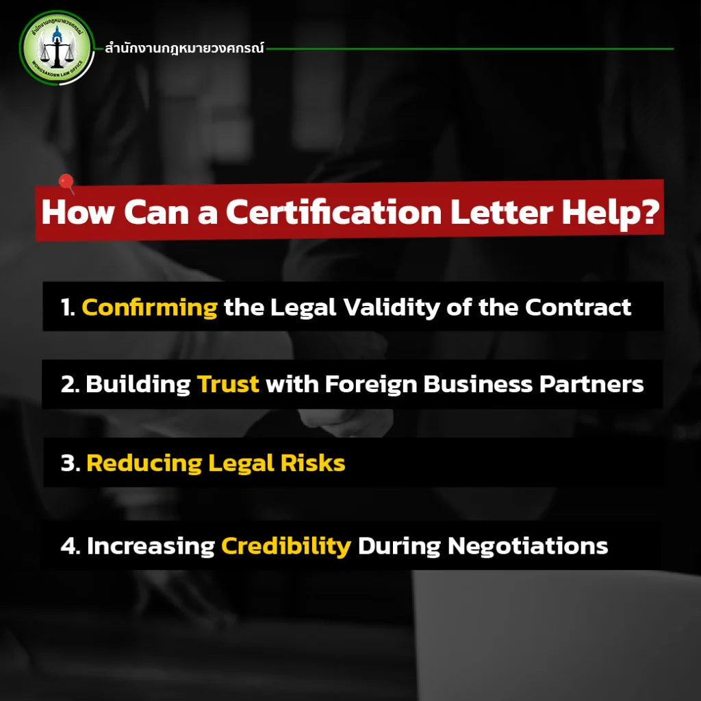 A Certification Letter issued by a Thai law firm or relevant legal authority assures foreign partners that if disputes arise, the contract can be used as a valid legal foundation.