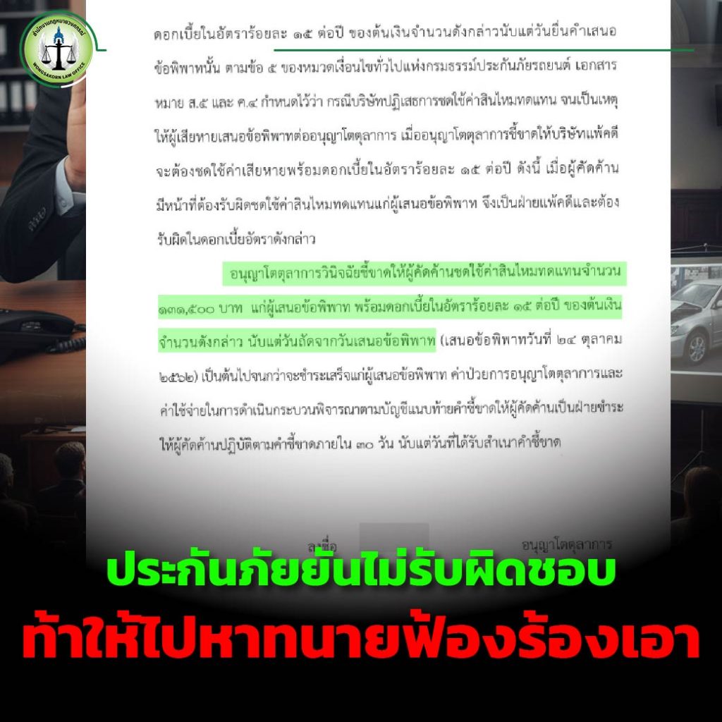 ประกันภัยยันไม่รับผิดชอบ ท้าให้ไปหาทนายฟ้องร้องเอา