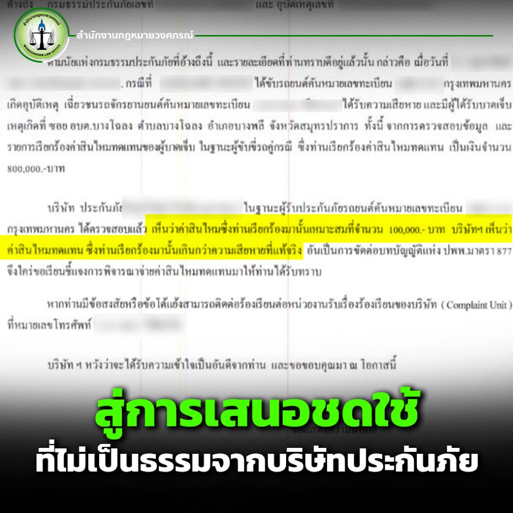 หลังการร้องเรียน บริษัทประกันภัยของคู่กรณีจึงออกหนังสือเสนอจ่ายค่าสินไหมทดแทนจำนวนเพียง 100,000 บาท โดยอ้างว่าเป็นตัวเลขที่เหมาะสมกับอาการบาดเจ็บที่ผู้เสียหายได้รับ