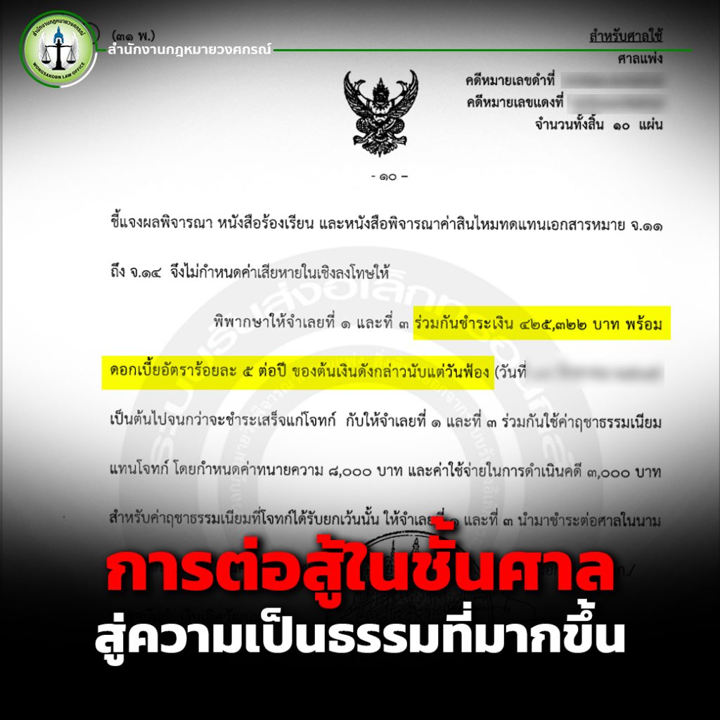 เมื่อการเจรจาไม่สามารถนำไปสู่การแก้ไขปัญหาที่เป็นธรรม สำนักงานกฎหมายวงศกรณ์จึงนำคดีขึ้นสู่ศาล โดยฟ้องทั้งคู่กรณีและบริษัทประกันภัยให้ร่วมกันรับผิดชอบค่าเสียหาย