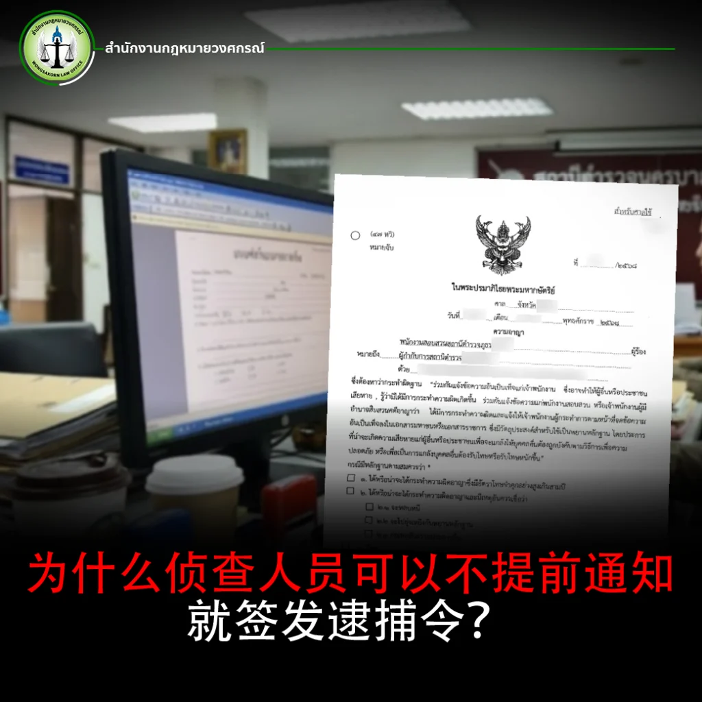 事实上,根据泰国法律,只要警察或侦查人员掌握充分证据,并有合理理由相信某人实施了刑事犯罪,即可依法向法院申请签发逮捕令,而无需事先通知嫌疑人。本文将为您详细说明什么是逮捕令、逮捕令如何签发、其与传唤令的区别,以及未及时核查逮捕令可能带来的重大法律风险。
