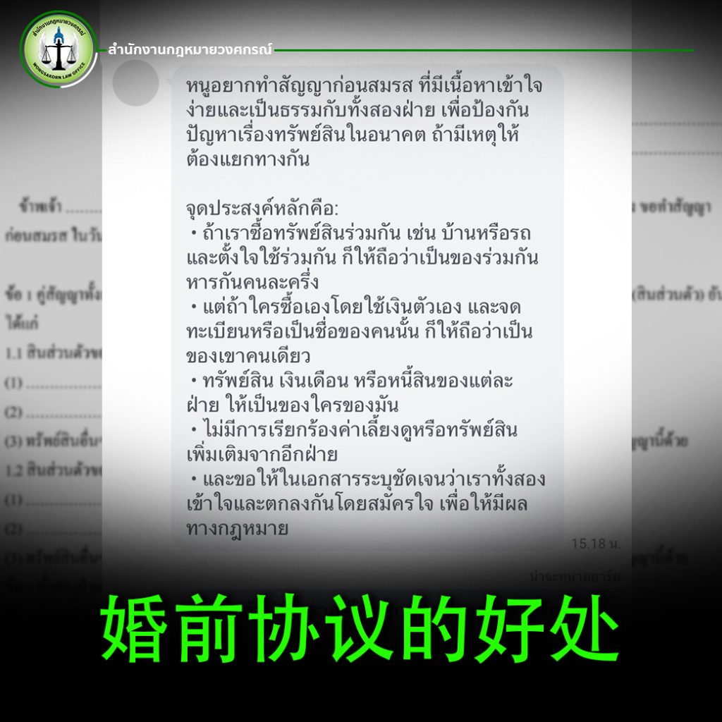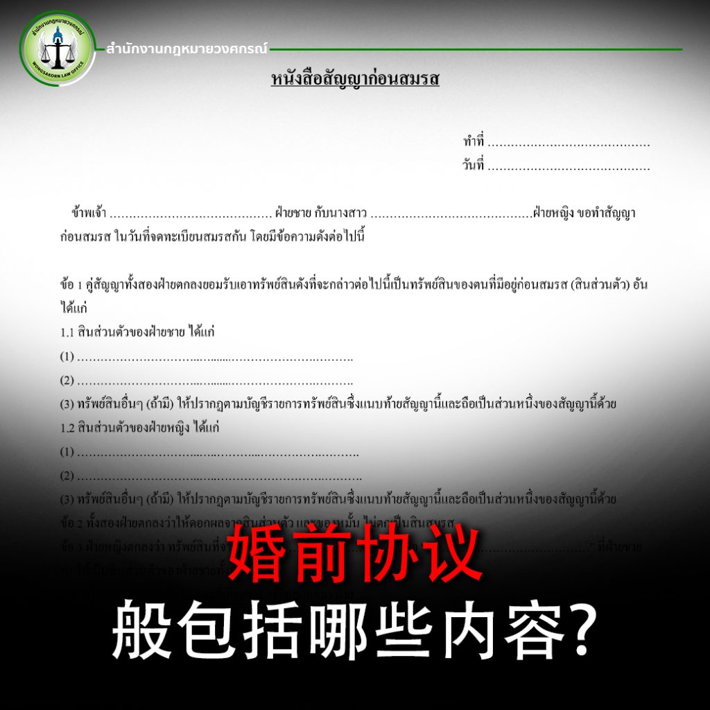 在泰国,这份协议必须以书面形式签署,并由双方共同签字,同时与结婚登记一起在户政事务所登记,才具有法律效力。