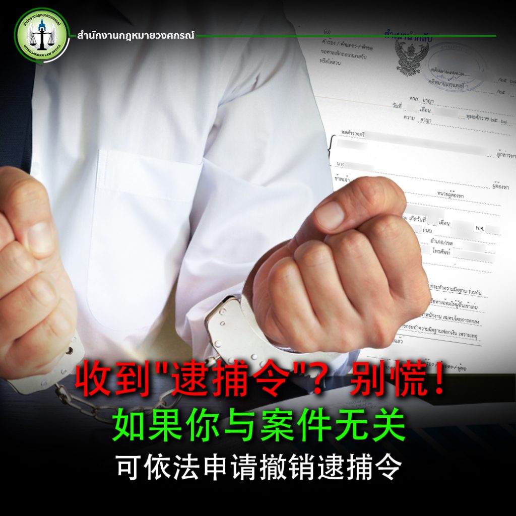 在泰国,“逮捕令”是由法院签发的法律文件,授权警方逮捕刑事案件中的嫌疑人。许多人在无辜的情况下被误发逮捕令,例如与嫌疑人同名或完全无关的案件。如果你遇到这种情况,可以向法院提交“撤销逮捕令的申请”来解决问题。