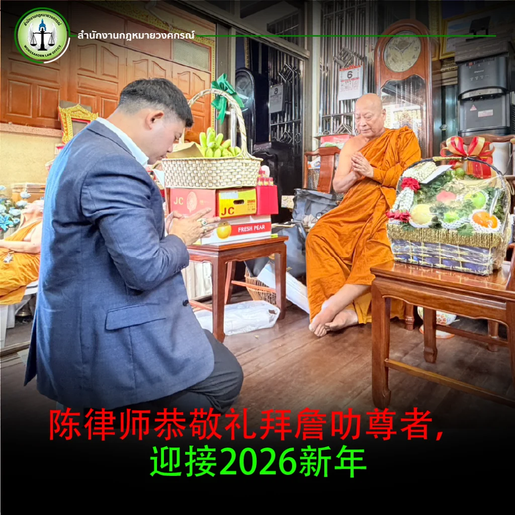 2026 年1 月6日,陈律师前往 Bang Phli Yai Nai寺庙,恭敬礼拜詹叻尊者,虔诚祈求新年的吉祥顺遂。陈律师专心聆听尊者的智慧教诲,强调 诚信正直、坚守德行与责任,为生活和职业发展提供宝贵指引。