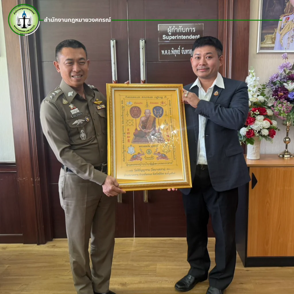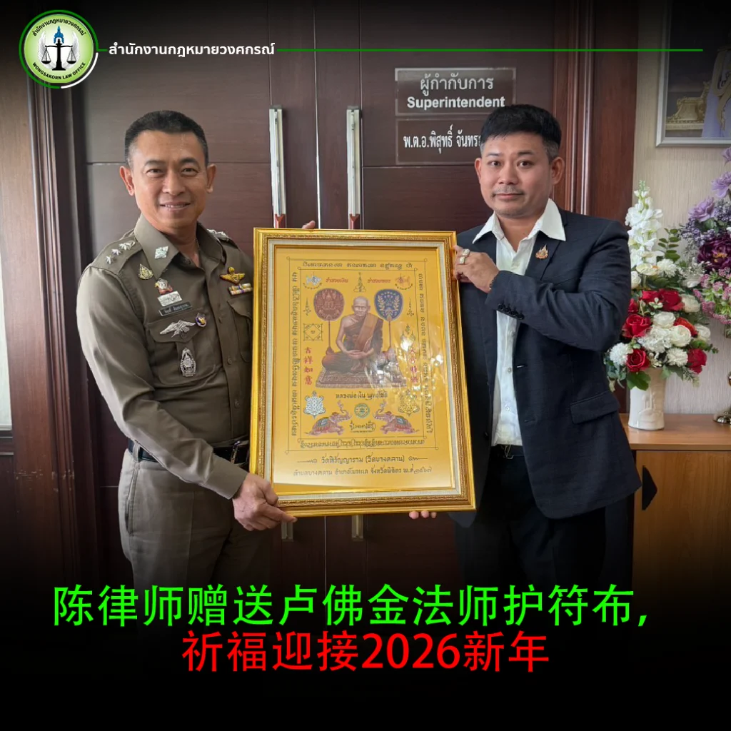 2026年1月6日,陈律师将卢佛金法师护符布赠予 Bang Kaeo 警察局局长批苏警上校,以示新年问候与敬意,祈愿新年吉祥顺遂。